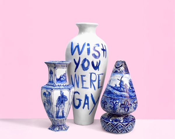 ExpoDwars door de collectiepresentatie staan keramische vazen, borden, buttplugs en gouden...